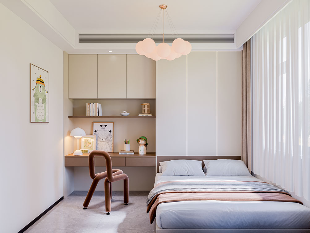??濟南阿達森裝飾為萬象東方設(shè)計的現(xiàn)代簡約風(fēng)裝修,以淺米色系打底,整面定制柜藏起雜亂的隱形收納巧思,正契合濟南寫字樓辦公室裝修里的高效空間利用邏輯;懸浮式電視柜的輕盈感,弱化了厚重感;環(huán)形吊燈勾勒柔和氛圍、通透紗簾引自然光漫入的設(shè)計,和濟南小型辦公室裝修里借光擴空間的思路異曲同工,整體既適配萬象東方的通透戶型,又用低飽和色調(diào)軟萌軟裝,把都市居所的舒適與松弛精準(zhǔn)落地,日常感與精致感剛好平衡。