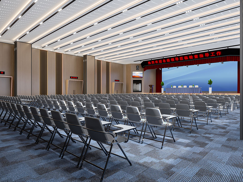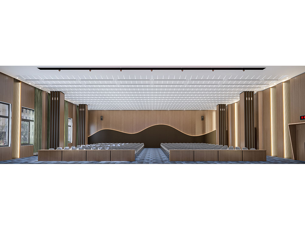 作為濟(jì)南辦公室裝修中大型功能空間的代表,該大堂報(bào)告廳以沉穩(wěn)木飾面 + 金屬線(xiàn)條鋪陳基調(diào),頂部穿孔吊頂搭配嵌入式燈光,兼顧聲學(xué)與視覺(jué)通透感。巨幅電子屏 + 對(duì)稱(chēng)音響設(shè)備適配會(huì)議、匯報(bào)需求,米色座椅與紅色臺(tái)階營(yíng)造莊重又舒適的氛圍,是濟(jì)南辦公室裝修中高規(guī)格功能空間的典型設(shè)計(jì)。